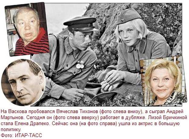 К сожалению, из них в живых сегодня только Вячеслав Шумский. - Все они побывали в самом пекле, а Валентина Галкина под огнем выносила раненых с поля боя. Они знали все тонкости и нюансы, - рассказал «КП» художник-декоратор фильма Евгений Штапенко. - Никто из зрителей и не заметит, какие подошвы у сапог немецкого десанта, а я вместе со специалистом вкручивал шестигранные шипы в подошвы, чтоб все натурально было. Старшину мог сыграть Тихонов Станислав Ростоцкий планировал на роль старшины Федота Васкова кого-то из звездных актеров, а на роли девушек - неизвестных актрис. Первыми пробовали Вячеслава Тихонова и Георгия Юматова. Тихонов был любимым актером Ростоцкого, а фронтовика Юматова выбрал Борис Васильев. Но после кинопроб Ростоцкий продолжил поиск актеров. Следующими кандидатами стали Юрий Оськин из Театра Комиссаржевской и Виталий Шаповалов из Таганки, игравший Васкова на сцене Таганки. Но в итоге героя-старшину сыграл 26-летний актер Московского ТЮЗа Андрей Мартынов. Девушек-претенденток искала по всей стране второй режиссер Ростоцкого Зоя Курдюмова. Елена Драпеко (Лиза Бричкина)