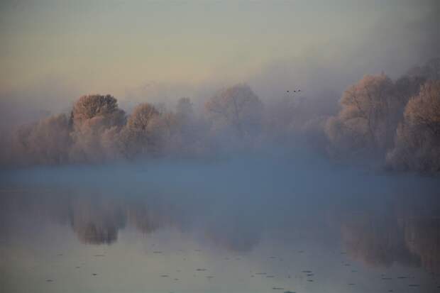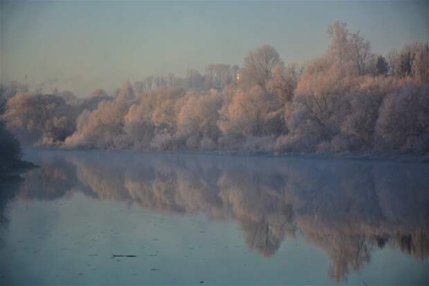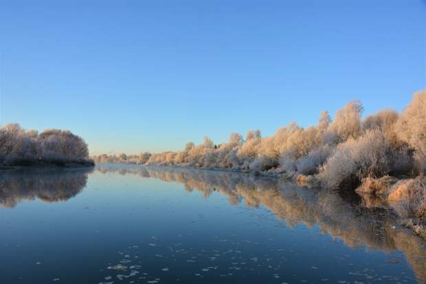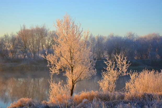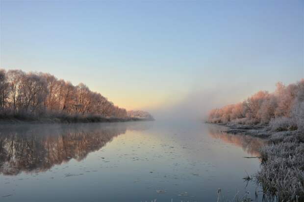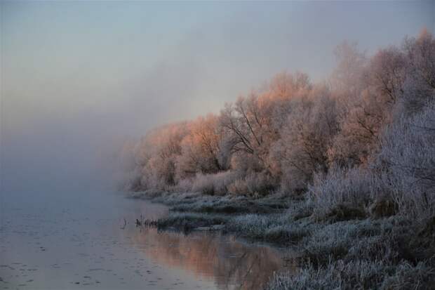 Ноябрьский рассвет дарит нам нечто совершенно волшебное. Это всё я увидел в минувшие выходные, выбравшись пораньше на реку. Накануне я посмотрел прогноз погоды. Синоптики обещали мороз, а влажность должна была быть повышенной, поэтому ожидался иней. Всё это и подтолкнуло меня проснуться в 7 утра, умыться, одеться и, захватив сумку с фотоаппаратом, выйти в сумерки.