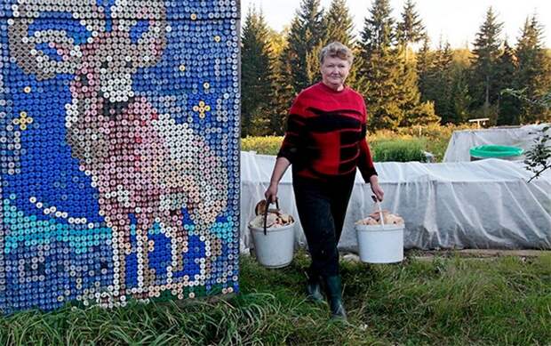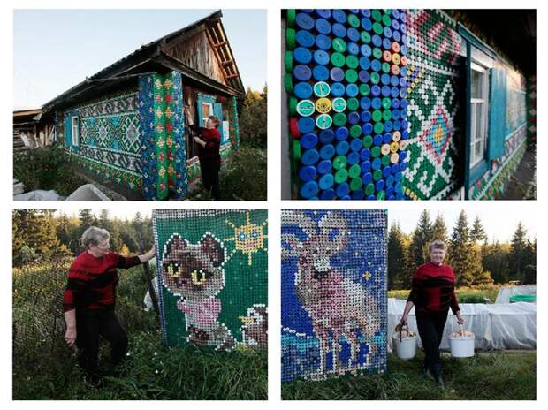 Таежная деревня Камарчага, что в Красноярском крае, теперь известна далеко за рубежом, а все благодаря своим талантливым творческим жителям. А прославила свою малую родину Ольга Костина, пенсионерка с золотыми руками и креативным мышлением, которая превратила свой дом в произведение искусства, украсив его мозаикой из 30000 крышек от пластиковых бутылок.